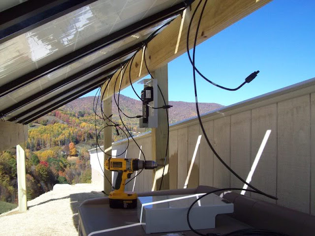 Next we measure the other side of the counter top and cut it down to 5 feet. Now we have to connect the 2 counters together on an angle. Using the saw horses and some boxes stacked on the floor, we lay the counter on top the way it is supposed to be on top of the cabinets. Then we glued the seam and while I held that tight Mike went underneath and bolted the seam together. Once everything was glued and bolted we "very carefully" lifted the entire counter and put it in place on top of the cabinets. I cleaned the excess glue and now we just have to put a few screws in to hold it in place. That's one thing nice about formica, once it is in, you are done. Now we are able to install the kitchen sink and faucet. Mike is underneath the sink clipping it in. The sink is in and the counter top is done. I think it looks great and I can't wait to use my new kitchen. Woo Hoo! Today was a really good day but very time consuming. We had to be so careful when we made the cuts in the formica. One mistake and we would have had to buy another 10 foot section. Mike did a good job Mike also ordered another water pump to replace the one that arrived broken. We also found out that our furniture will be delivered on Saturday, yeah! Wednesday 10-15 This morning we got another and hopefully our last propane delivery for the motorhome. If all goes well we will move into the house sometime next week. After the delivery truck left. Johnny from the gas company showed up to hook up our water heater. He couldn't do it the last time he was here because we didn't have the roof vent in. While he was here Mike asked him about the Bosch tankless water heaters. Johnny said we made the right choice by going with a standard water heater. He said there are a lot of problems with some of the tankless water heaters because they can't get the water hot enough. Anyway that's another opinion about tankless water heaters from our gas man. So if any of you decide to go with a tankless water heater do lots of research. Mike has figured out how we are going to mount our next 6 solar panels. We went to town to pick up the lumber to make our mount. We spent about $80.00 on 3 10ft 4x4's, 3 8ft 4x4's, and 2 2x8x14ft pressure treated boards. If we ordered a solar mount from any of the solar catalogs it would have cost us at least $700.00 plus the cost of the poles. We got home and started digging. Oh joy! We measured and dug the first 3 back poles about 3 1/2 feet into the ground. Mike is banging the poles in a little more. We also had to take out our original wind generator, you know after we cemented the pole in the ground. After the poles are in the ground we leveled the 14 foot cross board and screwed it in place. We will finish the rest tomorrow. Thursday 10-16 We started our day by digging the holes for the front 3 poles. We are trying not to make a mess so we put a tarp next our hole for the dirt and we cut out the curlex so we can dig a neat hole. Now we have all 6 poles in the ground and we decided to lower the back cross board so the panels aren't so high. We also installed the lower cross board. Then Mike cut the tops of the poles down using a chainsaw while I held the tops. We attached L brackets to the solar panels, lifted them up, and screwed them to our rack at a 15 degree angle. Our first panel is installed. Once we had a system it went very smoothly but we did work until dark. We got all 6 solar panels mounted onto our new rack. Now Mike has to wire the panels into the house. This is the first part of our "off grid" modifications. We realized that our original 6 panels and smaller wind generator weren't producing enough electric to keep our battery bank fully charged. As we keep making modifications we will keep you updated on the changes and how they are working for us. This is a big learning experience. Friday 10-17 Thankfully we got all the panels up yesterday because we had a rainy day. We couldn't get any work done outside. I went to town and did some errands while Mike organized his building. While I was in town I ran into the UPS man so I picked up our water pump. I'm sure the driver was very happy he didn't have to go up our driveway When I got home Mike went down to the house and installed and tested the new water pump. So far so good Saturday 10-18 Today is the "big day". Our furniture is supposed to be delivered this morning. Mike and I are really nervous because we don't know if the truck is going to make it up our driveway. We have a plan in case the truck doesn't make it (we always do). We will just have to unload everything into the barn, check it all, and Mike and I will have to bring the furniture up one piece at a time on the trailer. I really hope it doesn't come to that because I don't think Mike and I can lift some of the furniture. We did as much prep work as we can. Mike spent about 45 minutes grading every bump in the driveway. He really wants to make sure the truck makes it up our driveway. I look out the window and I see Mike parking the tractor. That means the delivery truck is here. Oh I am so nervous. Mike and I both stand at the top of the hill and watch the driver coming up to the top. The driver is going too slow ans sure enough he comes to a stop (oh no) and starts backing down the driveway. This is our nightmare and it is not looking good. Mike goes down with the tractor to see if he can do anything. Both men get out of the truck and go to the back. Mike blades the spot where they got stuck and comes back to the top. He told me "they shifted the furniture so most of the weight is over the rear wheels". Ok, they are starting up the driveway again. Oh god, I can't watch. C'mon C'mon. After an agonizing minute or so they make it. Woo Hoo. Oh happy day! It's happy dance time Everything looks great. Soon Mike and I will be moving in. We helped the movers. While they brought the furniture down to the house we helped untaped everything and folded up the blankets. They were very careful with everyth
